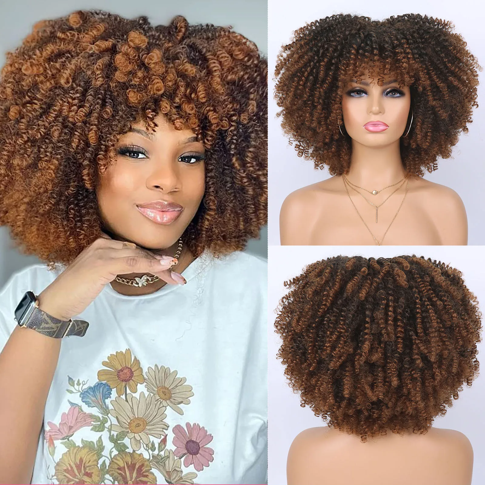 Rorange Synthetic Short Curly Wigs for Black Women Afro Wig With Bangs Short Afro Kinky Curly Wig for Daily Party Wear